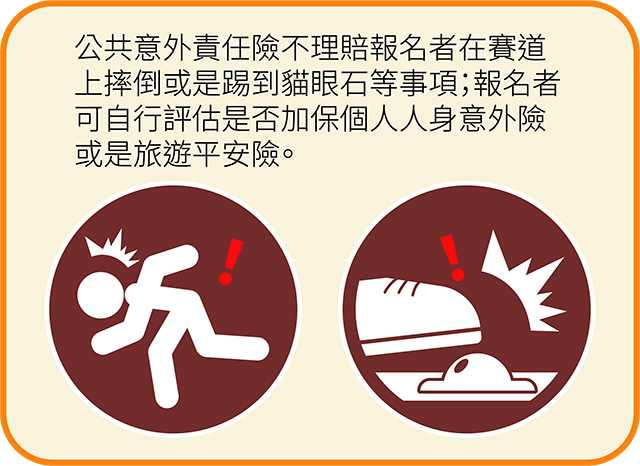 - (4)公共意外責任險不理賠報名者在賽道上摔倒或是踢到貓眼石等事項;報名者可自行評估是否加保個人人身意外險或是旅遊平安險。