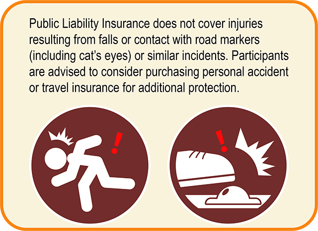- (4)公共意外责任险不理赔报名者在赛道上摔倒或是踢到猫眼石等事项;报名者可自行评估是否加保个人人身意外险或是旅游平安险。